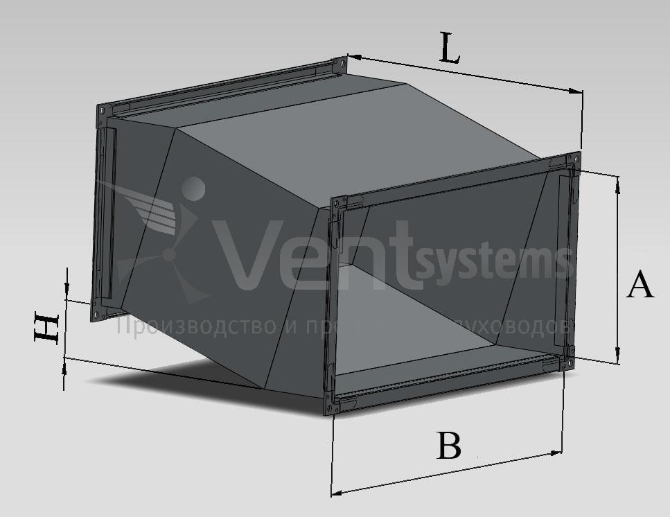 В случае, если воздуховоды на объекте невозможно разместить по прямой линии и необходимо сместить коммуникацию в сторону, используются специальные изделия S-образной формы - утки. Для заказа утки прямоугольного сечения нужно выбрать ее параметры: длину и ширину сечения, длину участка и размер смещения.