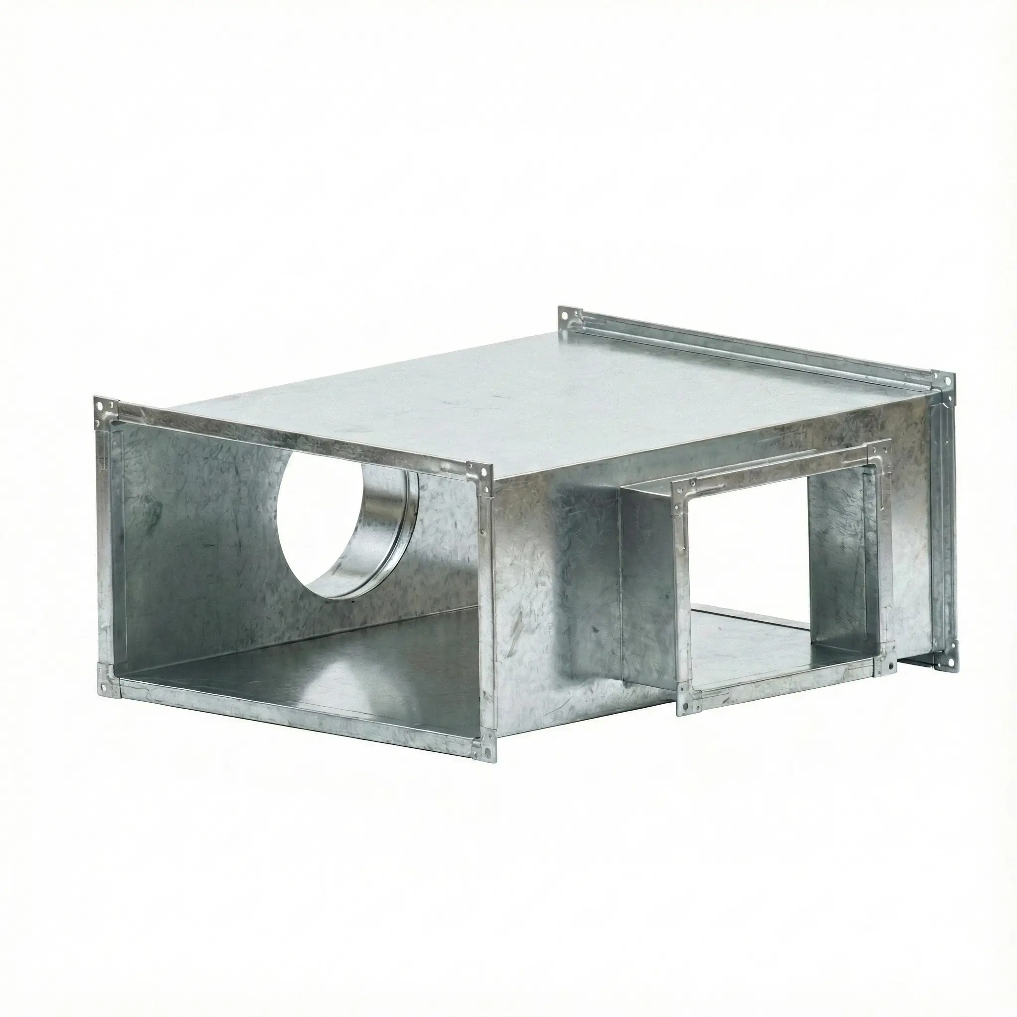 Крестовина прямоугольного сечения с комбинированными врезками предназначена для организации пересечения и разветвления вентиляционных магистралей, в которых сочетаются воздуховоды различного типа сечения. Изделие применяется в системах общеобменной вентиляции и кондиционирования при необходимости подключения круглого канала к прямоугольной сети.