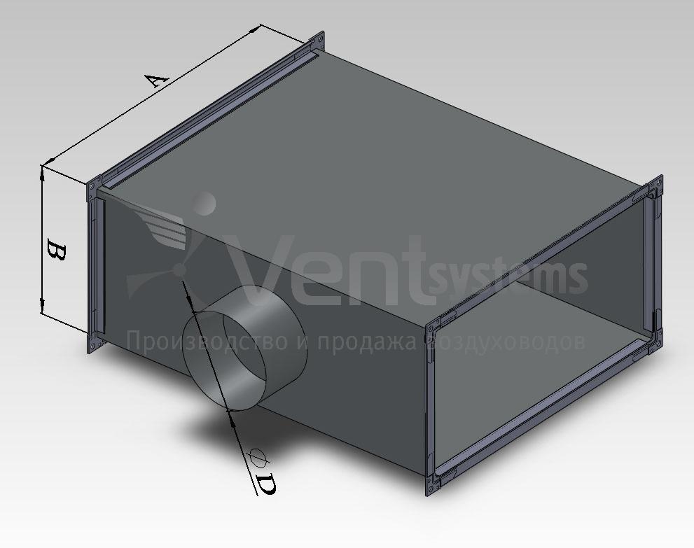 Данный тройник имеет прямоугольный корпус и круглую врезку, то есть стыкует друг с другом элементы разного сечения.