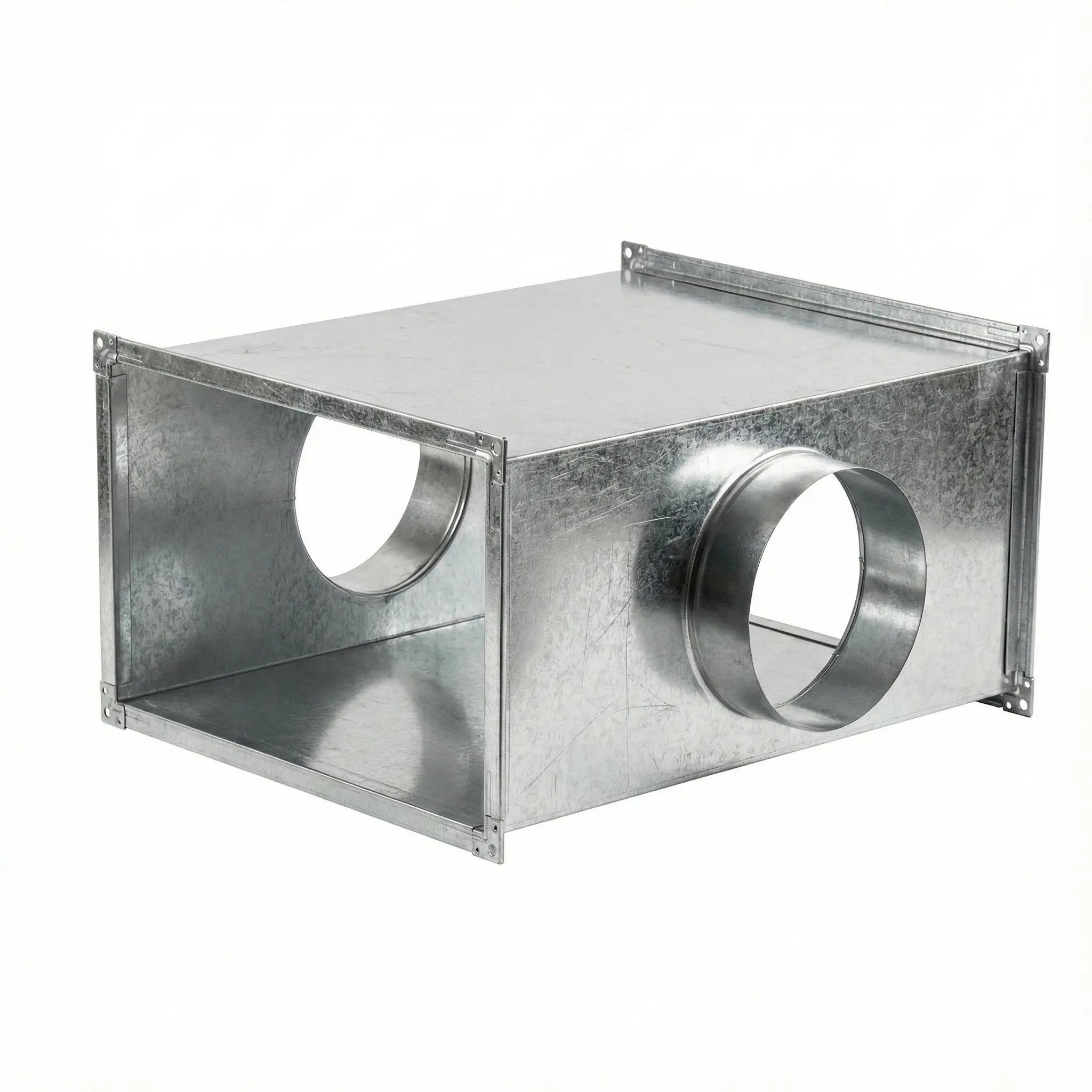 Крестовина прямоугольного сечения с круглыми врезками предназначена для организации пересечения и разветвления вентиляционных магистралей, в которых требуется подключение круглых воздуховодов к прямоугольной сети. Изделие применяется в системах общеобменной вентиляции и кондиционирования при сложной трассировке инженерных коммуникаций.