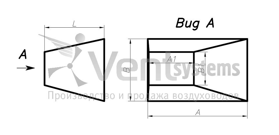 Данный переход стыкует прямоугольные воздуховоды разного размера. Смещение является центральным левым.